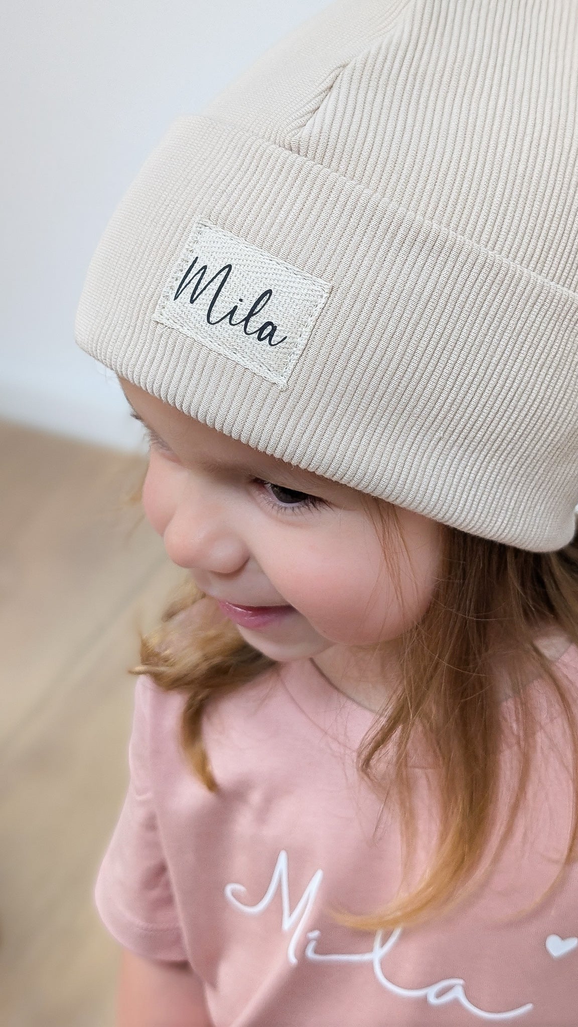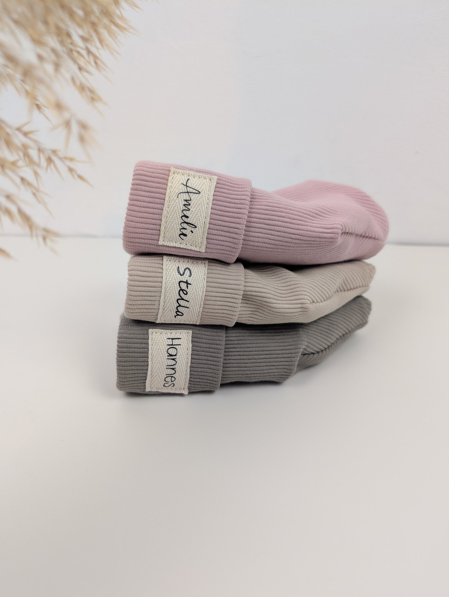 Die moderne Rippenstruktur macht diese Beanie zu einem echten Hingucker, der sich vielseitig kombinieren lässt. Du hast die Möglichkeit, die Mütze ganz nach deinem Geschmack mit einer individuellen Farbe und einem personalisierbaren Patch zu gestalten. Auf dem Titelbild siehst du die Farben Helles Altrosa, Beige und Smokey Beige.